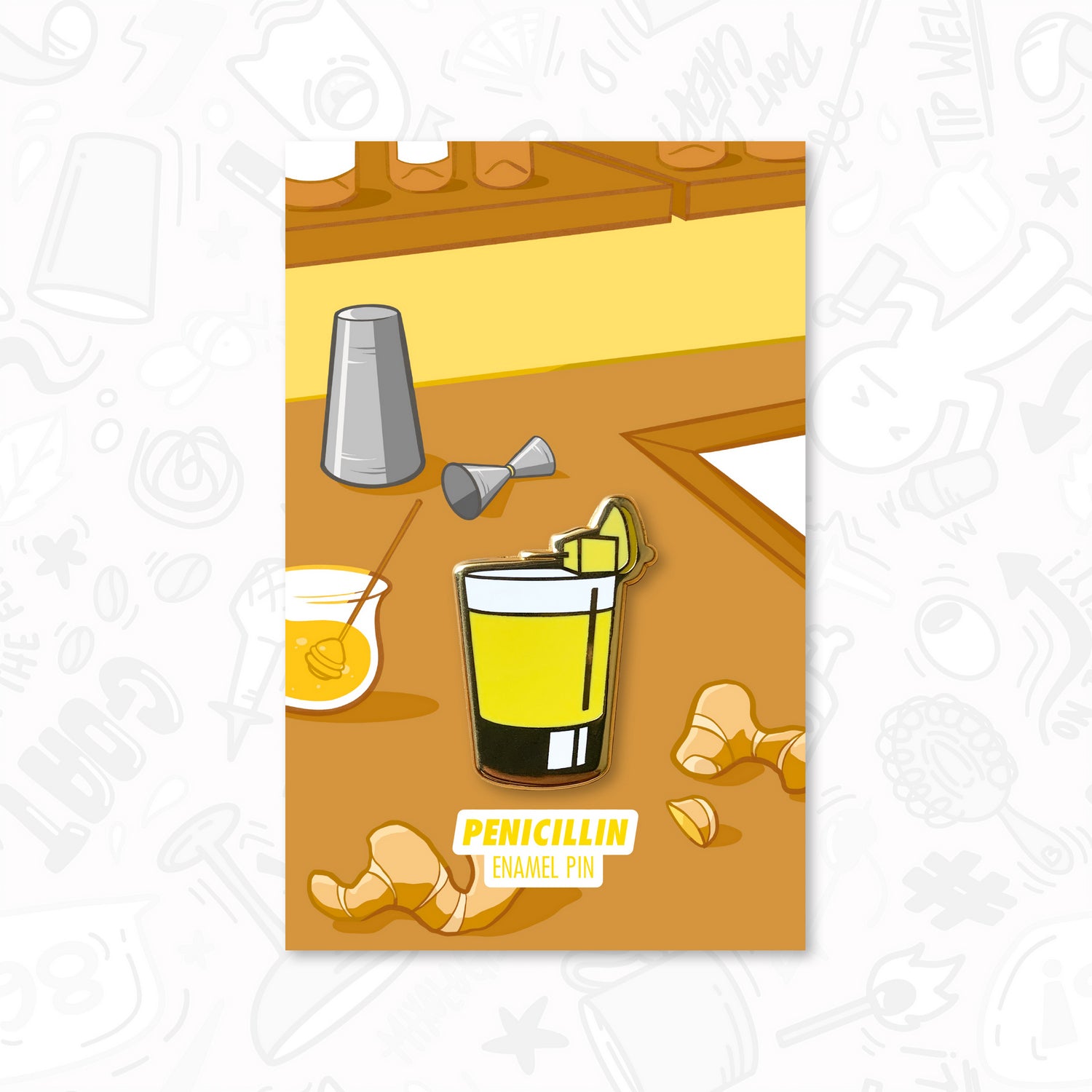Embrace the smoky allure of the Penicillin cocktail with this enamel pin. Designed to capture the essence of this modern classic of Scotch whisky, honey-ginger syrup, lemon juice and a splash of Islay Scotch.